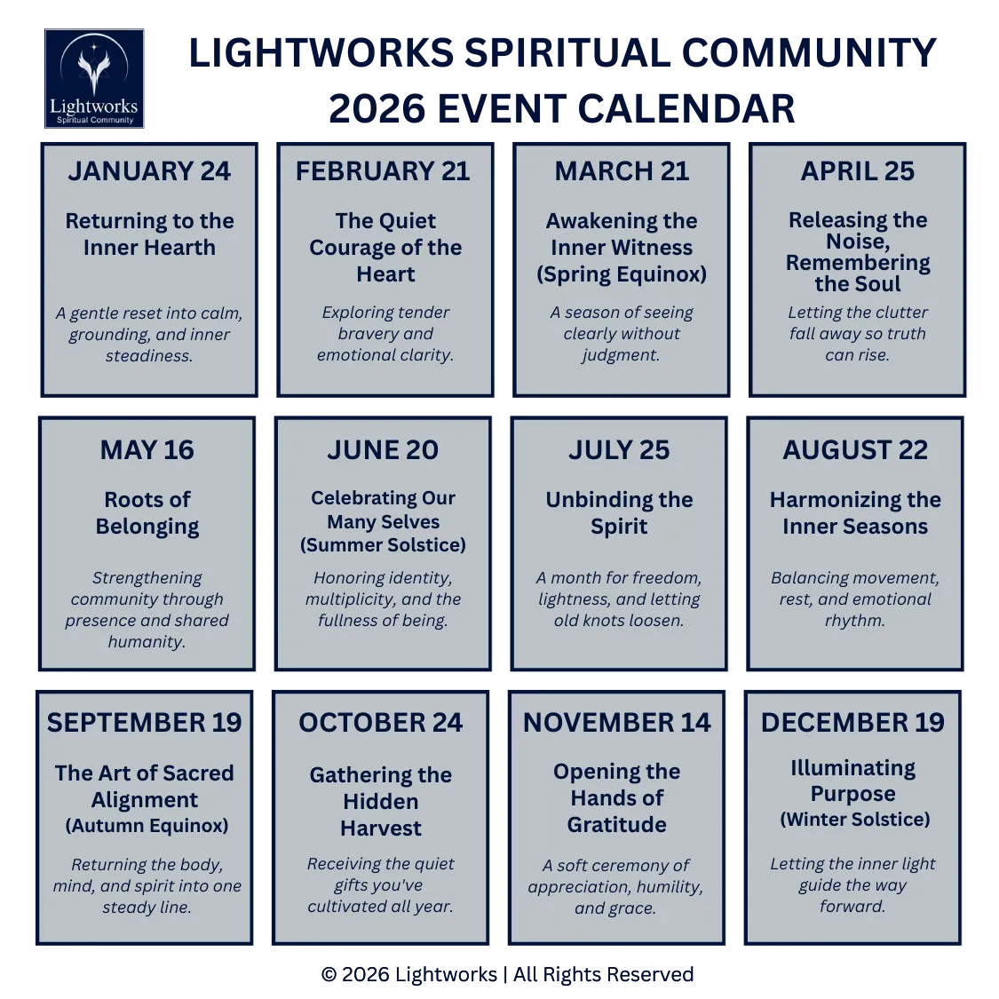 Lightworks gatherings invite you to pause, reflect, and engage with others through conversations, seasonal offerings, and shared experiences that support growth and belonging.